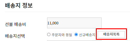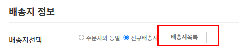 2. 배송지정보 창에서 수령하시고자 하는 방문지점을 선택해주시고(물류센터 또는 서울매장 중에 선택)