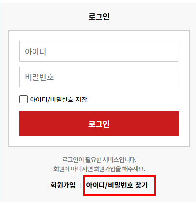 >>> 사이트나 어플 접속 후 우측 상단 로그인 누른 후 아이디/비밀번호 찾기 클릭 (과정 아래 하단 사진 참고)