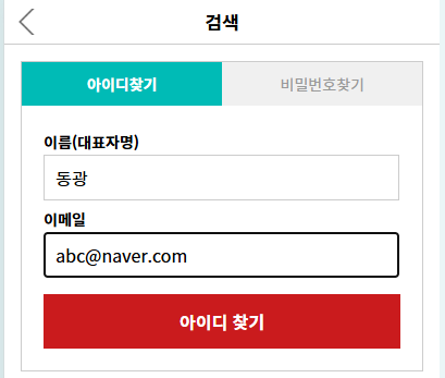 ㅁ 아이디 - 이름(대표자명) / 이메일 - 아이디 찾기 클릭