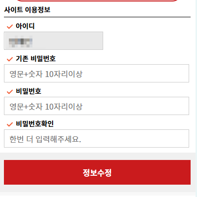 3. 기존 비밀번호 입력 > 영문+숫자+특수문자 10자리 이상 > 한번 더 입력 > 정보수정