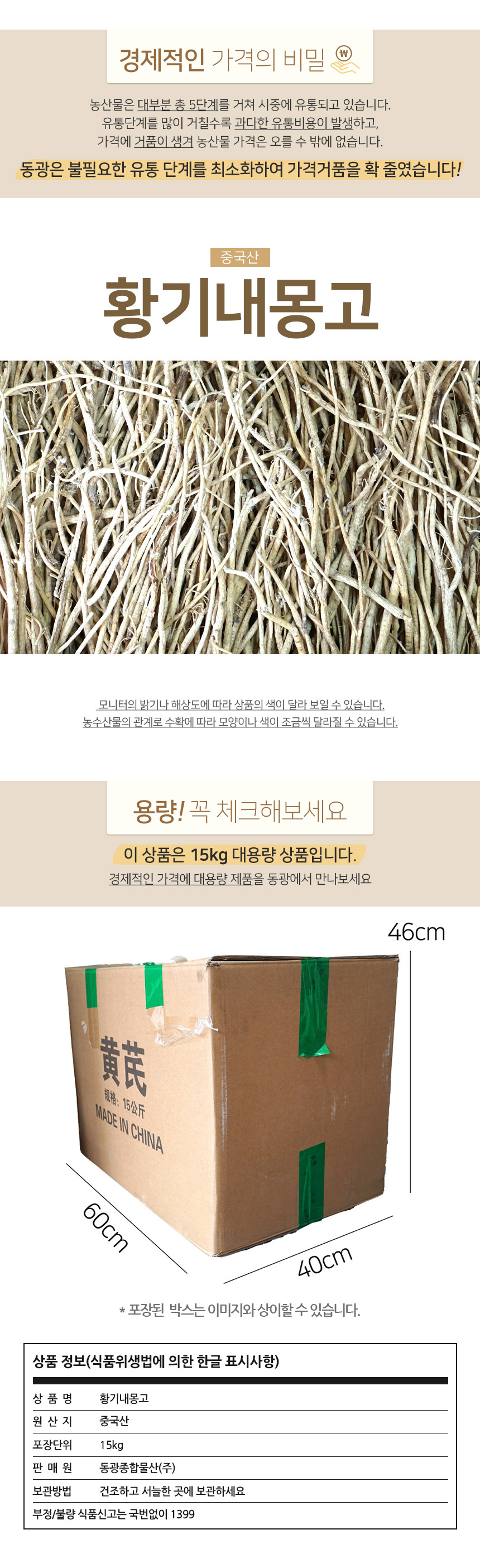 길이는 약25~33cm색깔 황갈색 굵기 담배굵기보다가늘다(4~6mm) /황기가 중간중간에 상처가 있는 부분 흑갈색 으로변함/삼계탕용& 육수용& 달임용으로사용