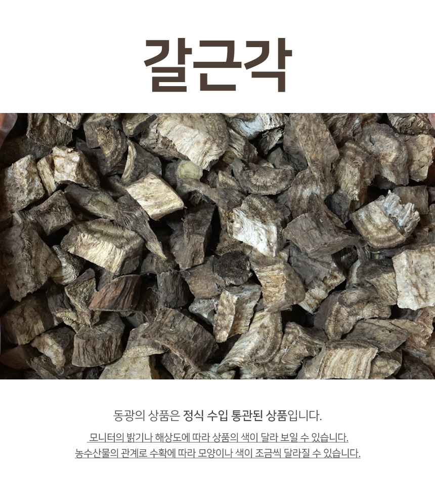 칡에 검은색은 엑기스가 나온 상태 건조한 것, 갈근의 녹말성분이 절단면과의 마찰에 의해 수분이 빠져나가지 못해 어두운색을 띄게 됨, 이는 곰팡이나 변질된 것이 아닙니다 식물성