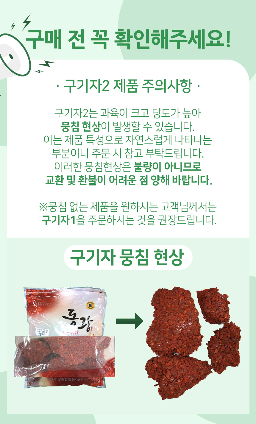 중국 영하지역 구기자/과육이 크고 당도가 높아 과육과 당도로 인해 뭉침 현상이 있고 유의해서 주문 요망! 뭉침으로 인한 교환 환불 불가/습기에 노출되면 바로 뭉