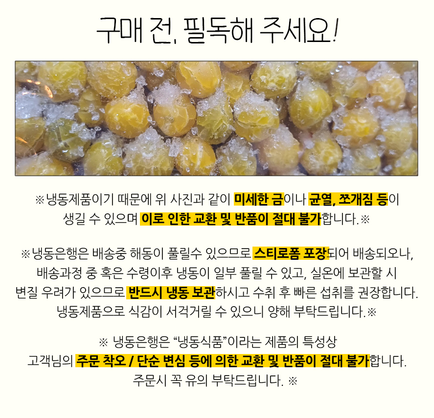 [24개1박스20,000원할인] 소비기한 2년의 은행껍질 제품으로, 껍질을 완전히 제거해 냉동 보관합니다. 해동 후 재냉동은 불가하며 교환·반품이 불가합니다.