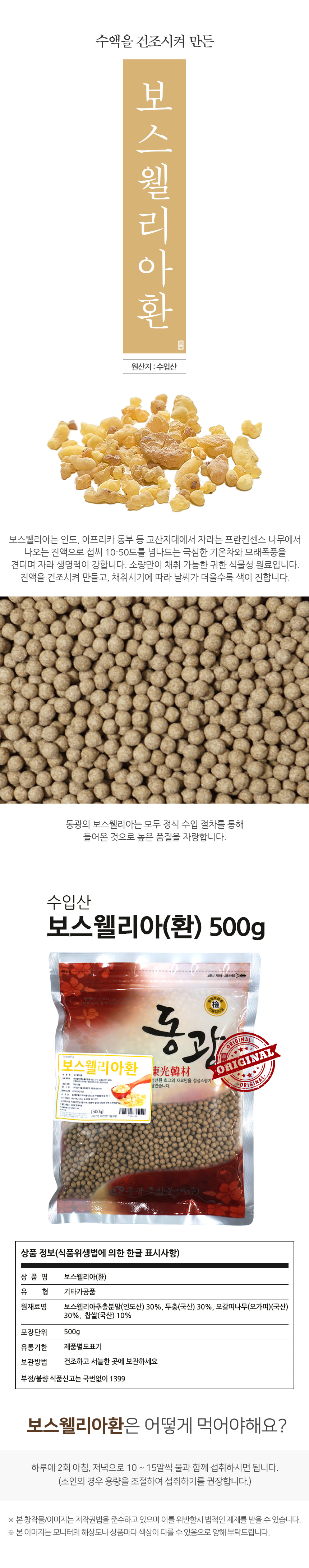 보스웰리아추출분말/인도산 30%, 두.충(가지)/국내산 30%, 오.가.목(절)/국내산 30%, 찹쌀 10%코팅X
