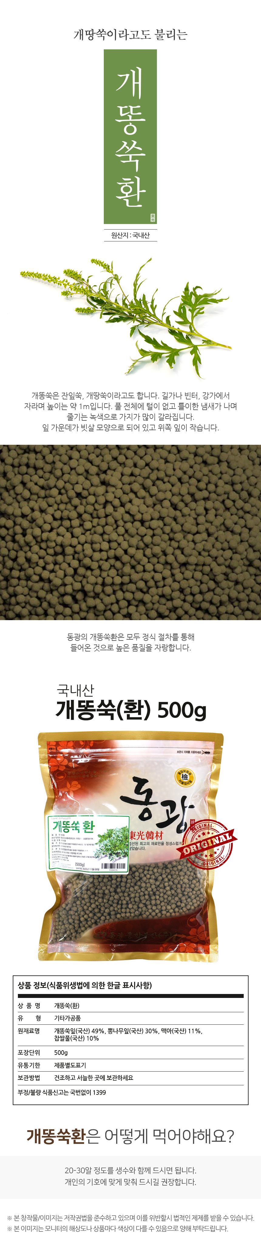 개똥쑥/(국내산) 49%, 상엽/국내산 30%, 맥아/국내산 11%, 찹쌀풀10%코팅X
