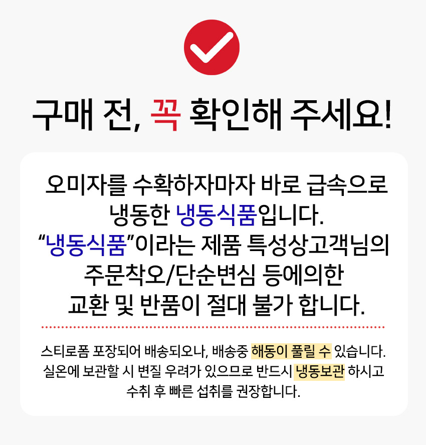 [30박스 구매시 30만원 할인][교환 및 반품 불가] 세척되지 않음, 영하 25도에서 급냉 시킴, 배송중 제품이 녹을 수 있음