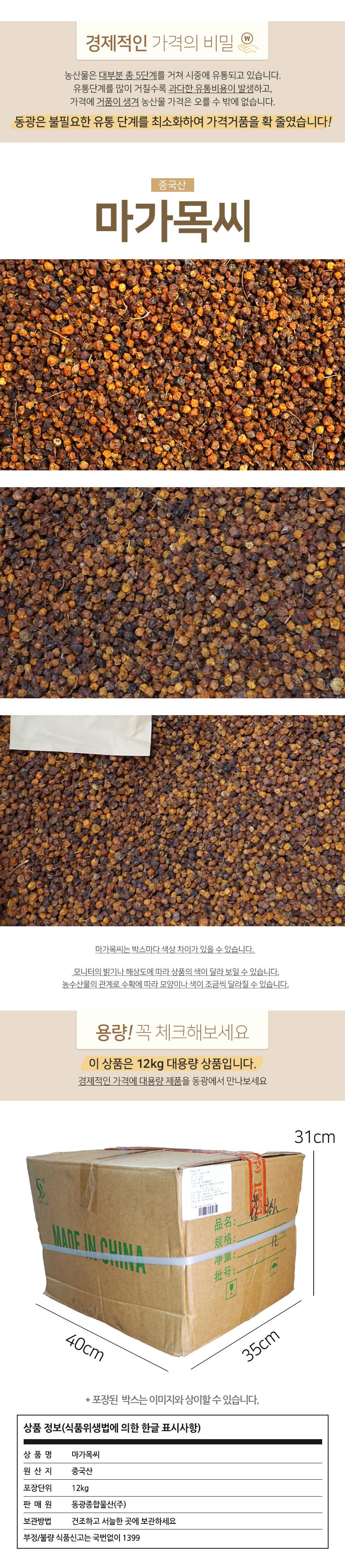 기존 입고 제품과 달리 열매 중 일부에 살짝 거뭇한 색상이 섞여 있으며, 전반적으로 색감이 어둡습니다. 제품 내부에는 가루 방습제(연갈색 봉투)가 동봉되어 있습니다.