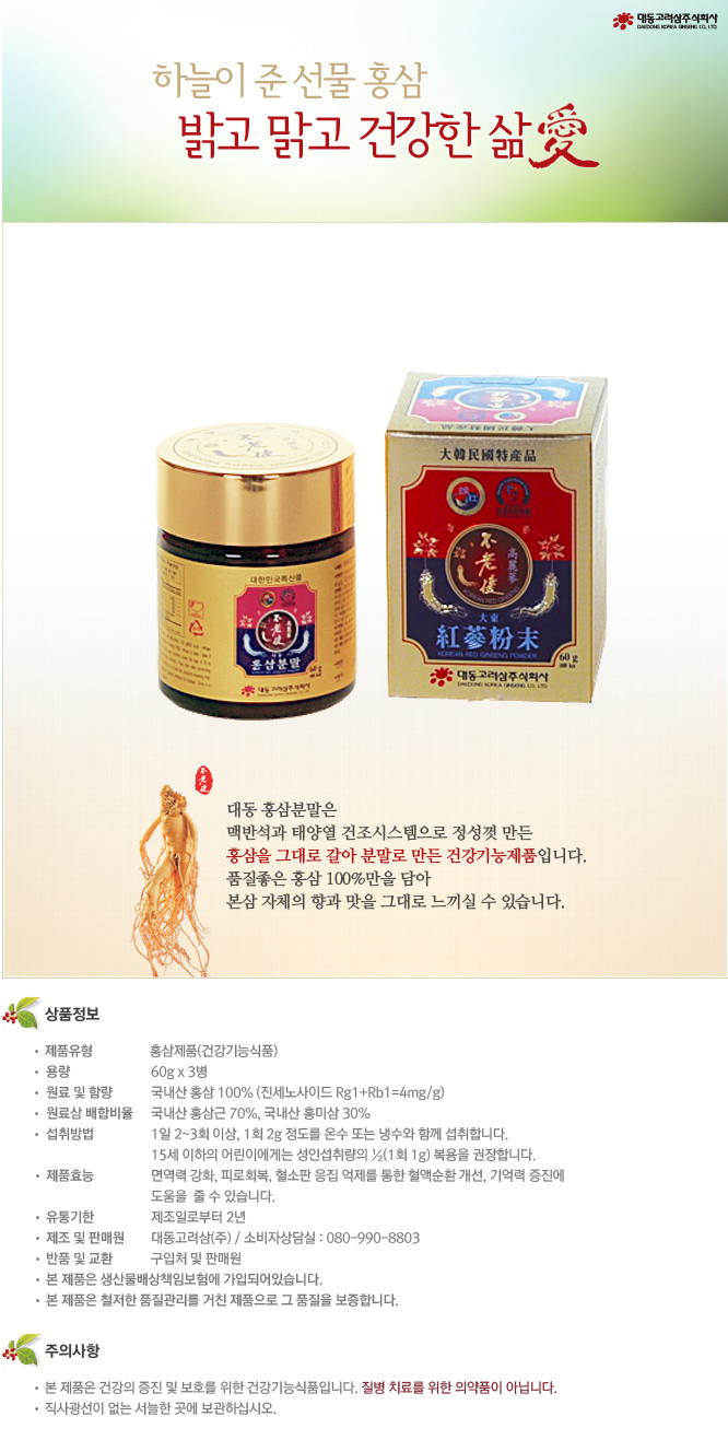1일2~3회, 1회3g을 따뜻한 물에넣고 저어드세요 / 홍삼100%(홍삼근70%,홍미삼30%) /진세노사이드 Rg1+Rb1=4mg/g 함유