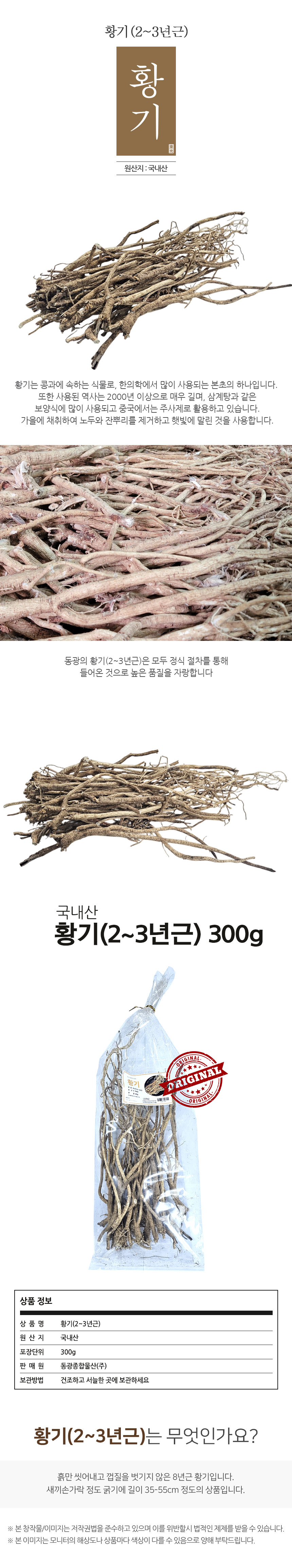 2~3년근 통황기를 그대로 건조한 제품으로, 거피가 완전하지 않아 누런빛과 거뭇한 부분이 있음. 자연스러운 원물 특성이니 참고해주세요.