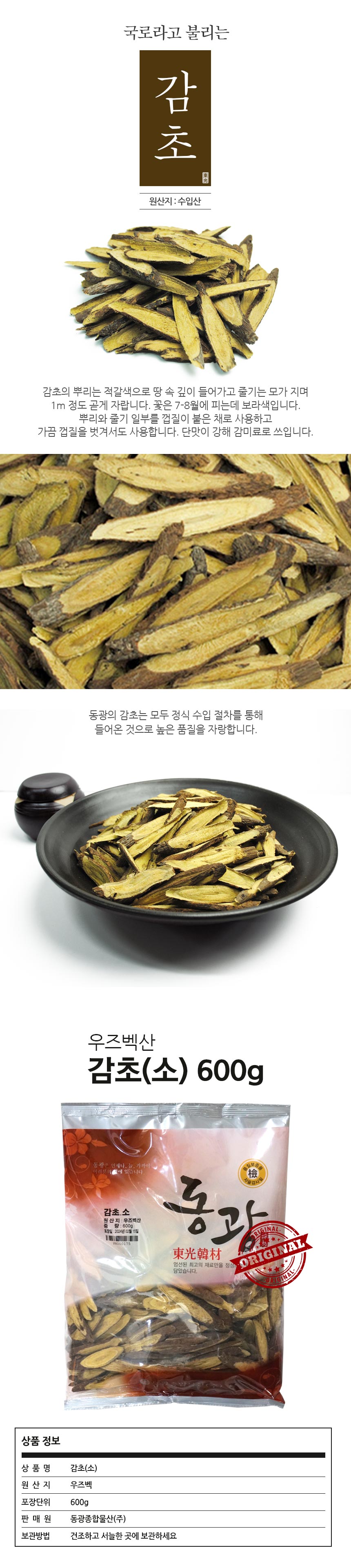 자연산으로 겉에는 흙갈색 안은 노란빛을 띄고, 맛은 단맛이 강해 일반감초에3~4배 강한 맛이납니다. 동광에서 판매중인 우즈벡 감초중 가장 자잘하게 썰린 제품입니다.