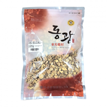 일반 절단 황기는 어슷썰기 형태이나, 원편 황기는 지름 0.7~1cm 내외의 황기를 직각 절단해 단면이 원형입니다.