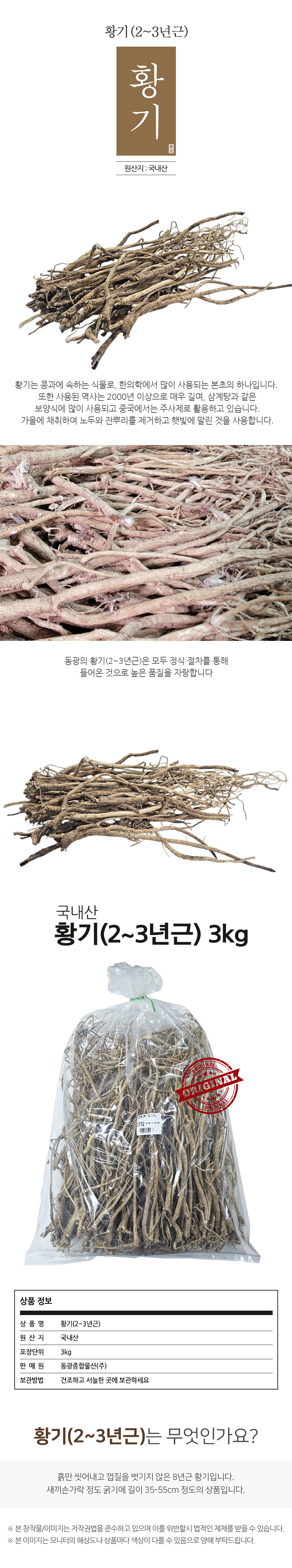 2~3년근 통황기를 그대로 건조한 제품으로, 거피가 완전하지 않아 누런빛과 거뭇한 부분이 있음. 자연스러운 원물 특성이니 참고해주세요.