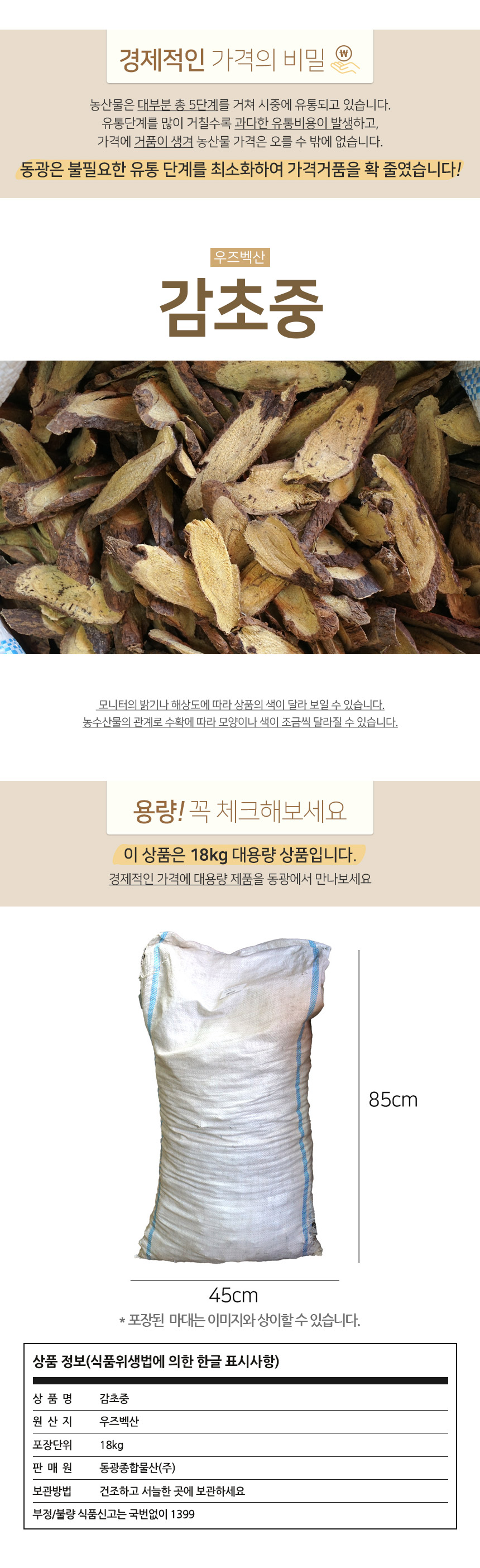 자연산으로 겉에는 흙갈색 안은 어두운노란색을 띄고, 맛은 단맛이 강해 일반감초에3~4배 강한 맛이납니다. 동광에서 판매중인 우즈벡 감초중 썰린 정도가 중간크기의 제품.